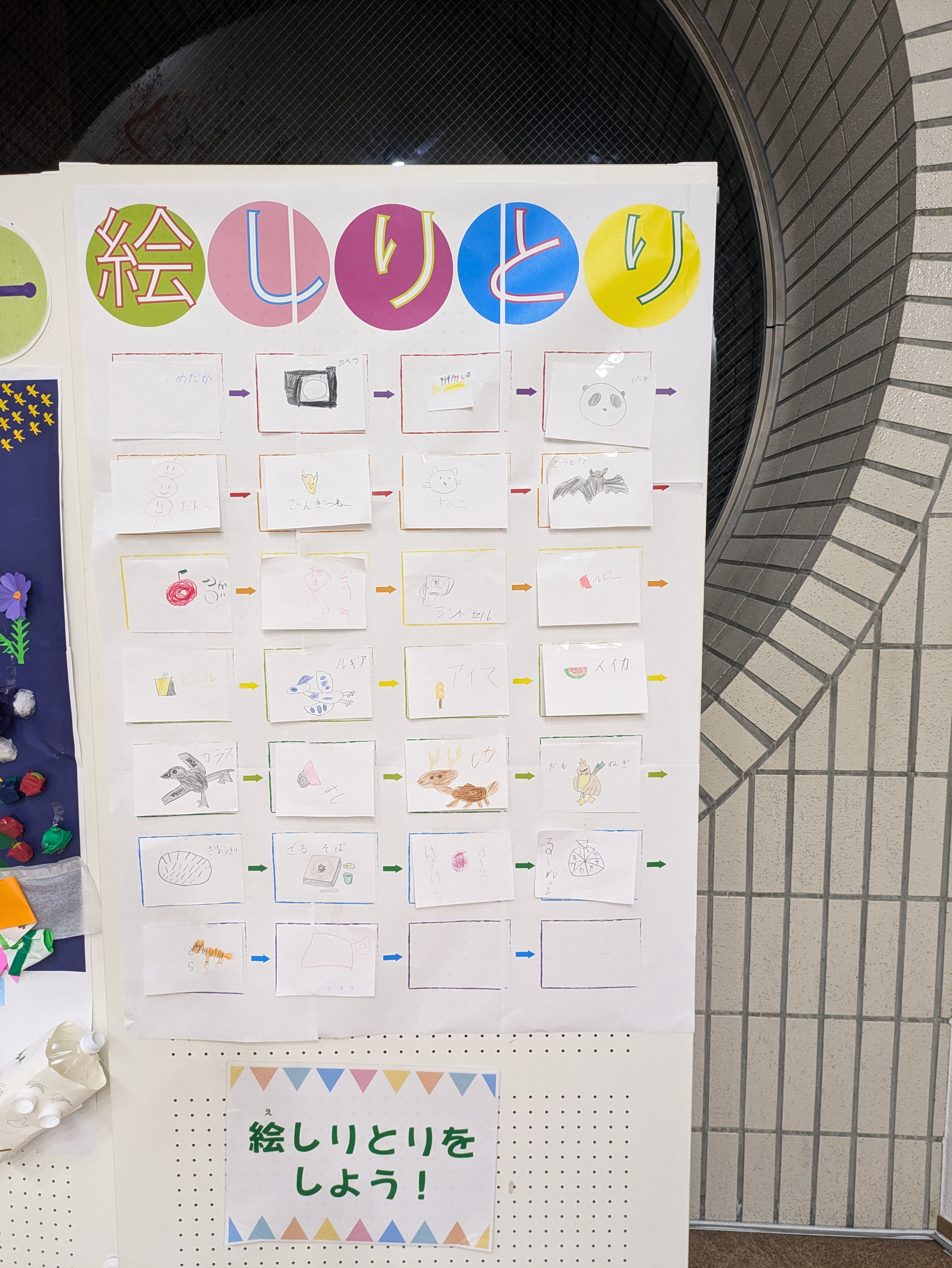 絵を描いてしりとりを完成させよう!完成した絵しりとりは本館使用の入口に掲示します。