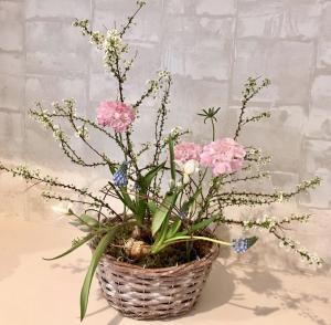 ムスカリやミニチューリップ等の根付きのお花を使用して春のアレンジメントを作ります。春の芽吹きを感じる...